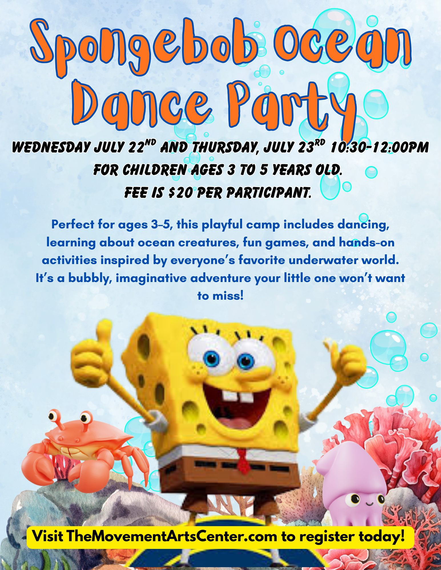 The cost is $20 per participant. It’s a bubbly, imaginative adventure your little one won’t want to miss! 🧽✨